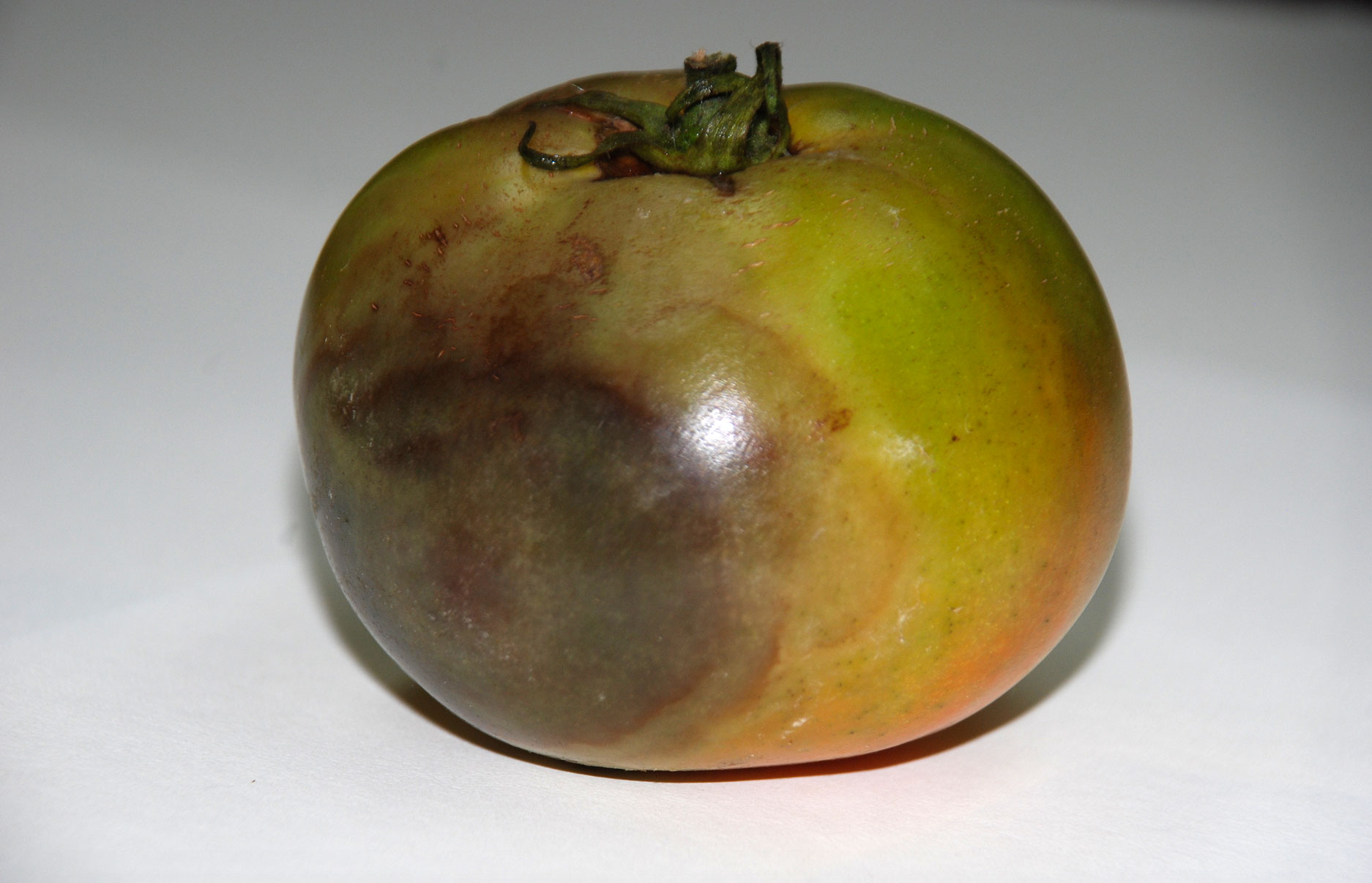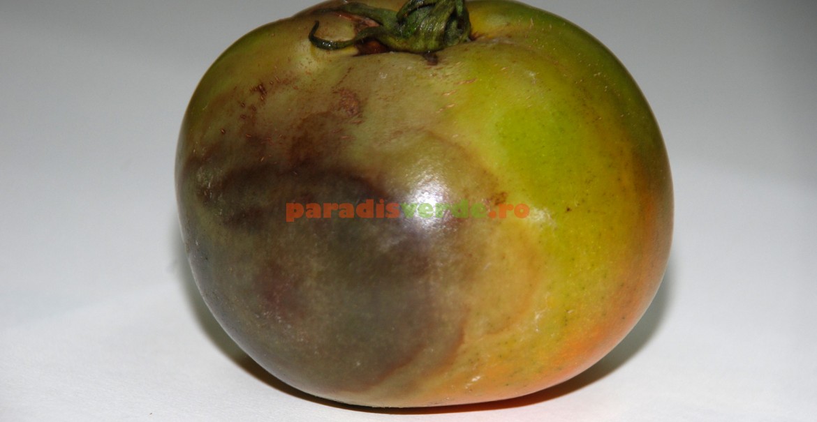 - Când patogenul pătrunde în fruct, tomatele putrezesc în formă de „ochi de iepure”. De regulă sunt afectate tomatele de la baza plantei. Acestea, odată atacate, nu-și mai continuă maturarea.