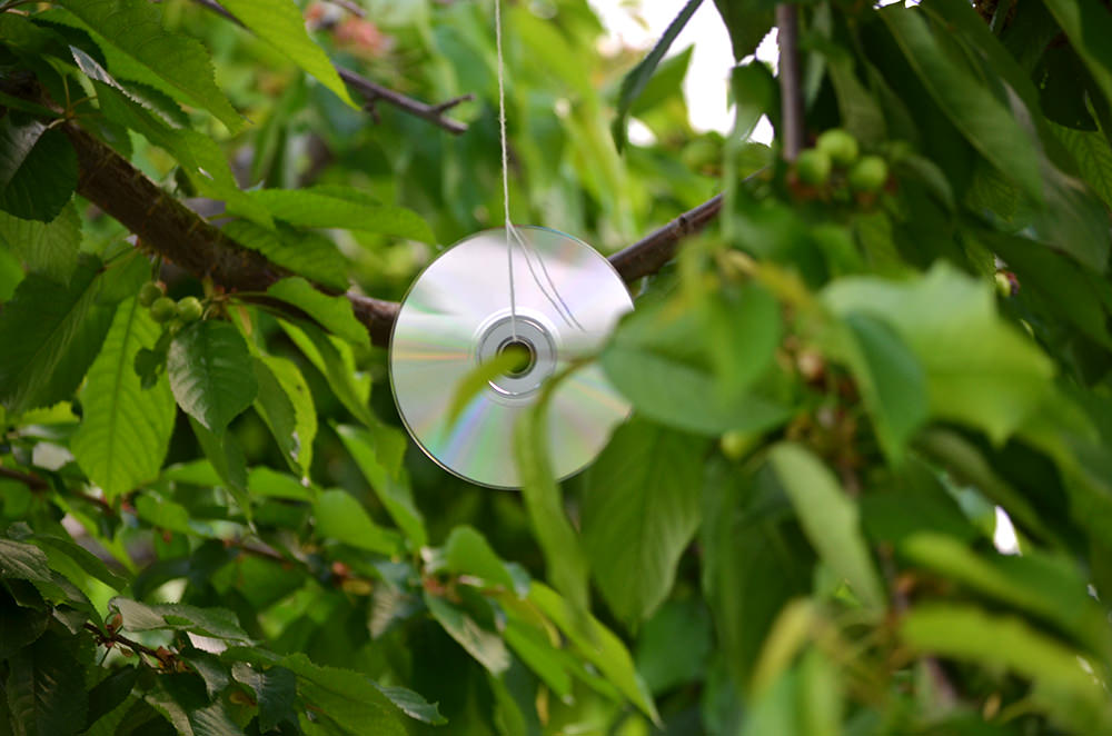 5-8 CD-uri, legate larg cu aţă şi plasate strategic în coroana cireşului, au efecte impresionante.