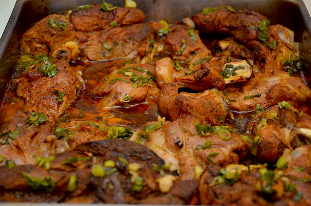 Carnea de miel, bine odihnită în baiţ, se aşază într-o tavă cu pereţii mai înalţi.