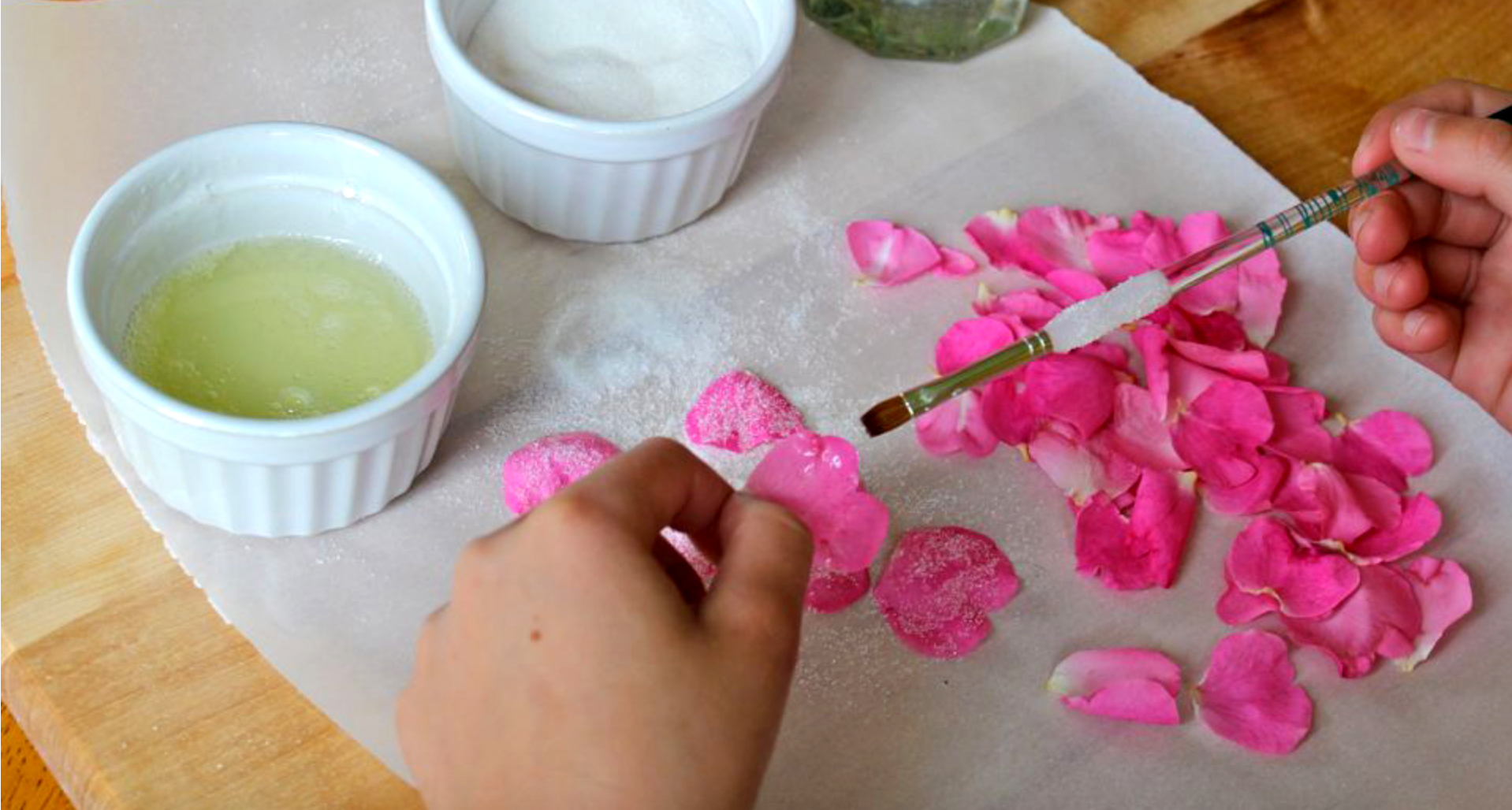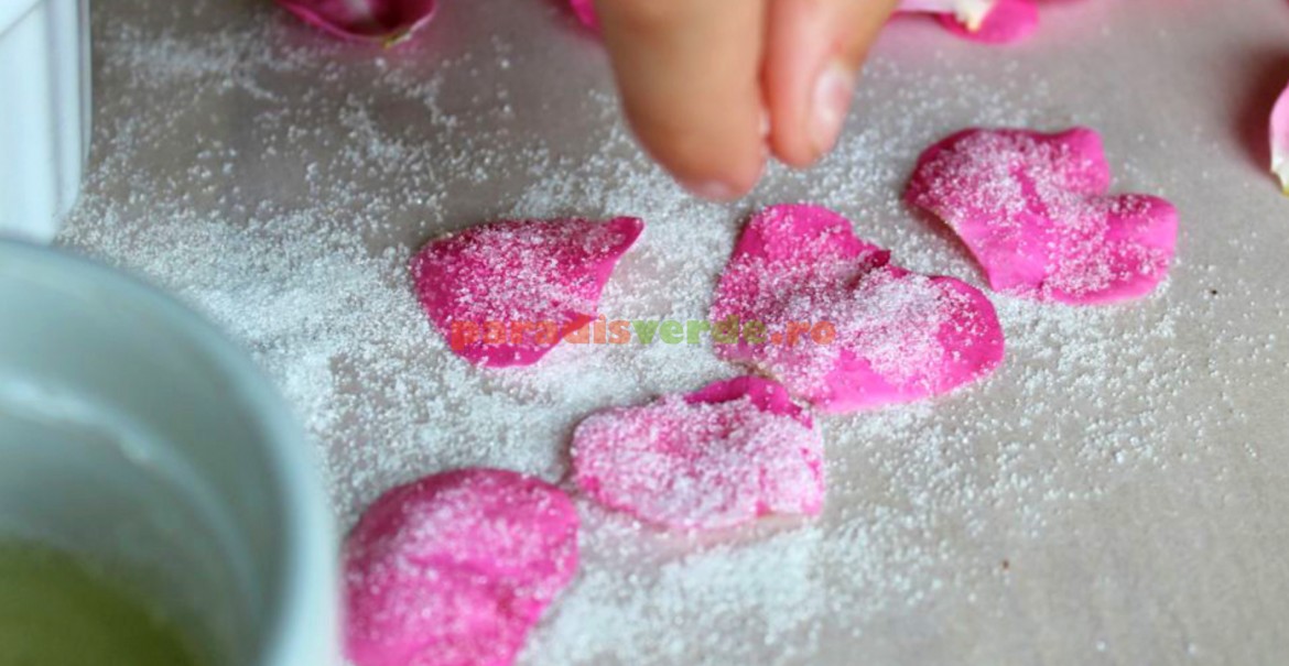- Se presară zahăr pe ambele fețe, apoi petalele se lasă la uscat peste noapte, pe o coală de hârtie de gătit.