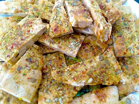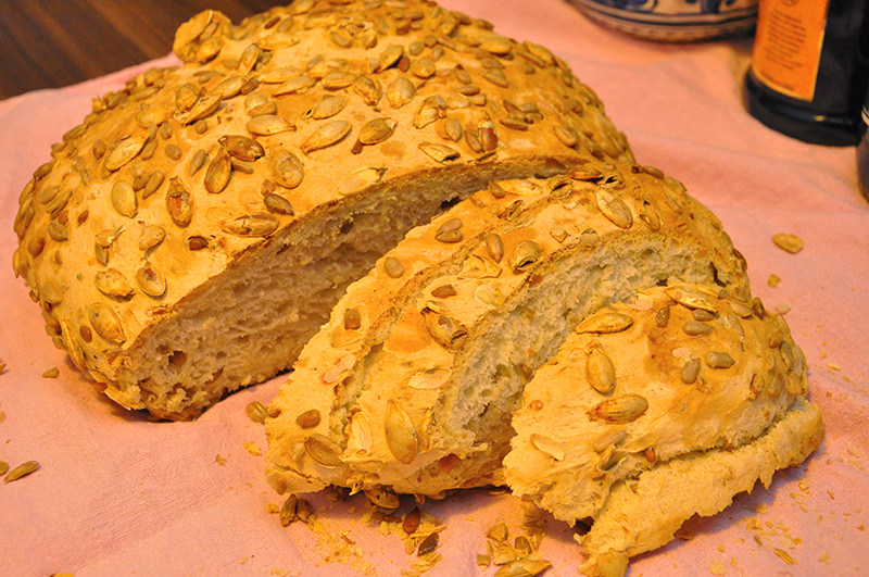 Se lasă 15 minute la crescut, după care tăvăliți boțul de aluat pe un pat de semințe de dovleac și floarea-soarelui.