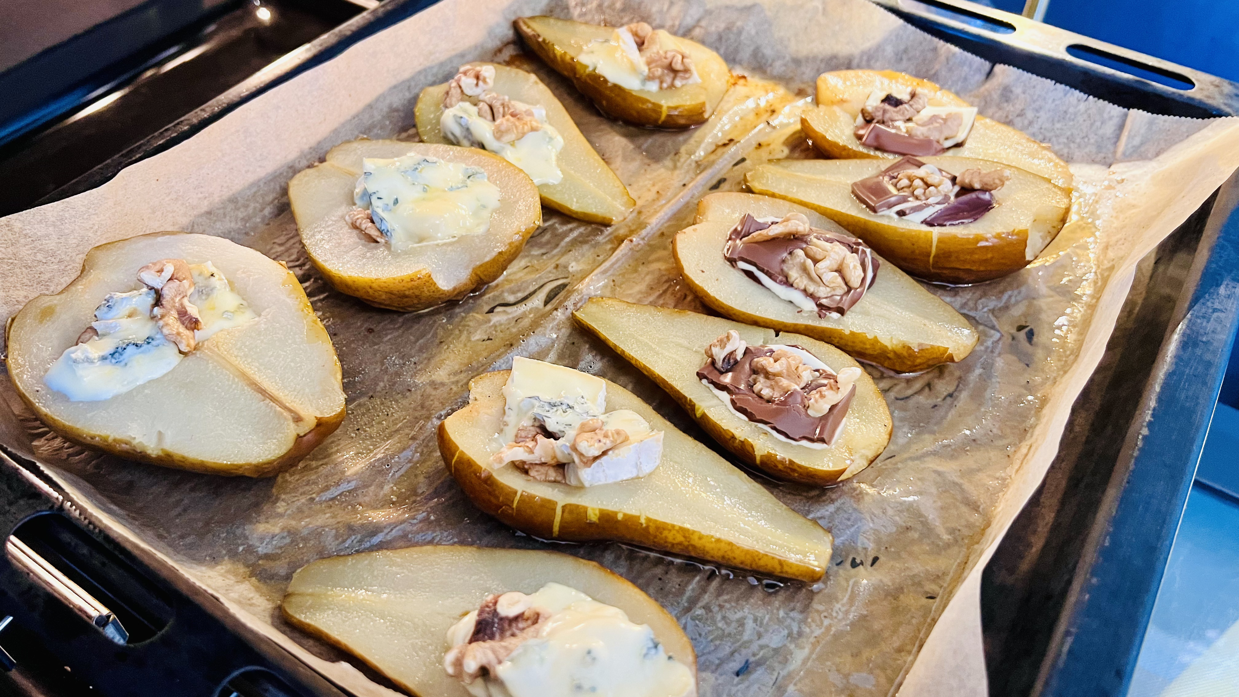 - După 30 de minute, când perele s-au copt, le întoarcem cu tăietura în sus și așezăm pe ele bucățele de fromage bleu sau brie, plus nuci și chiar merișoare uscate, dacă avem (noi n-am avut, de data asta).