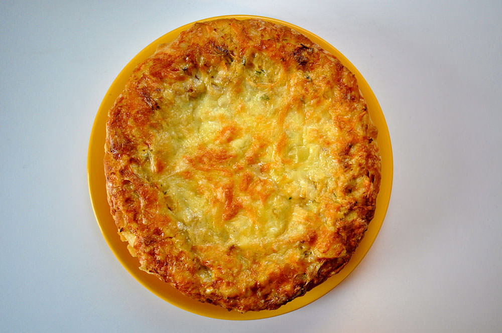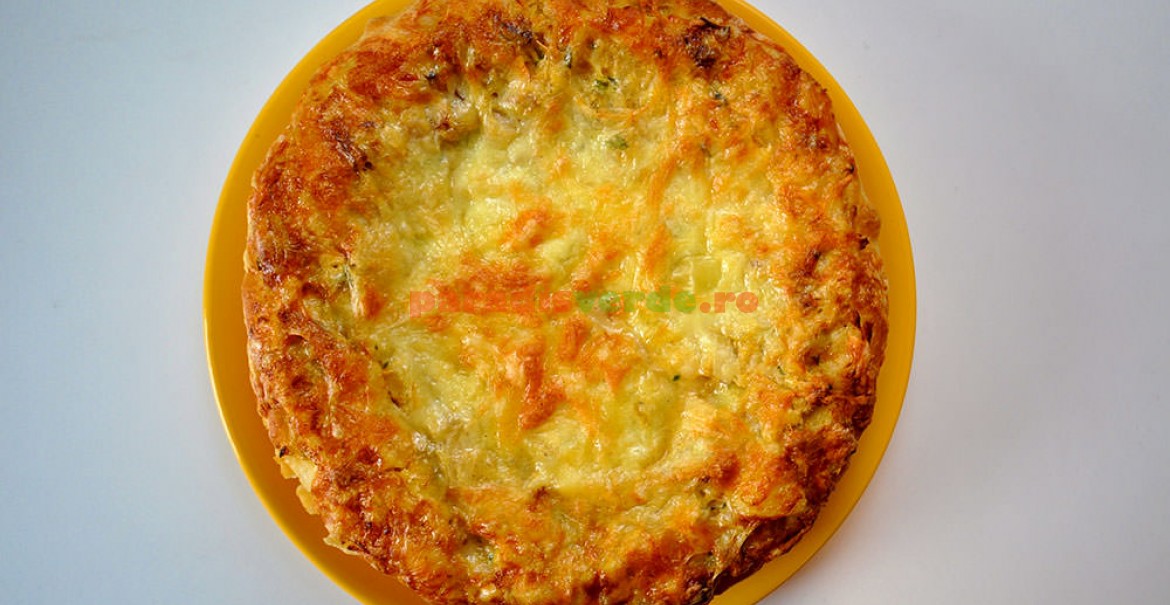 Într-o tavă rotundă cu pereţi detaşabili, uns cu ulei, se pune aluatul ridicându-se cât mai mult pe pereţii vasului. Se adaugă la mijloc umplutura.