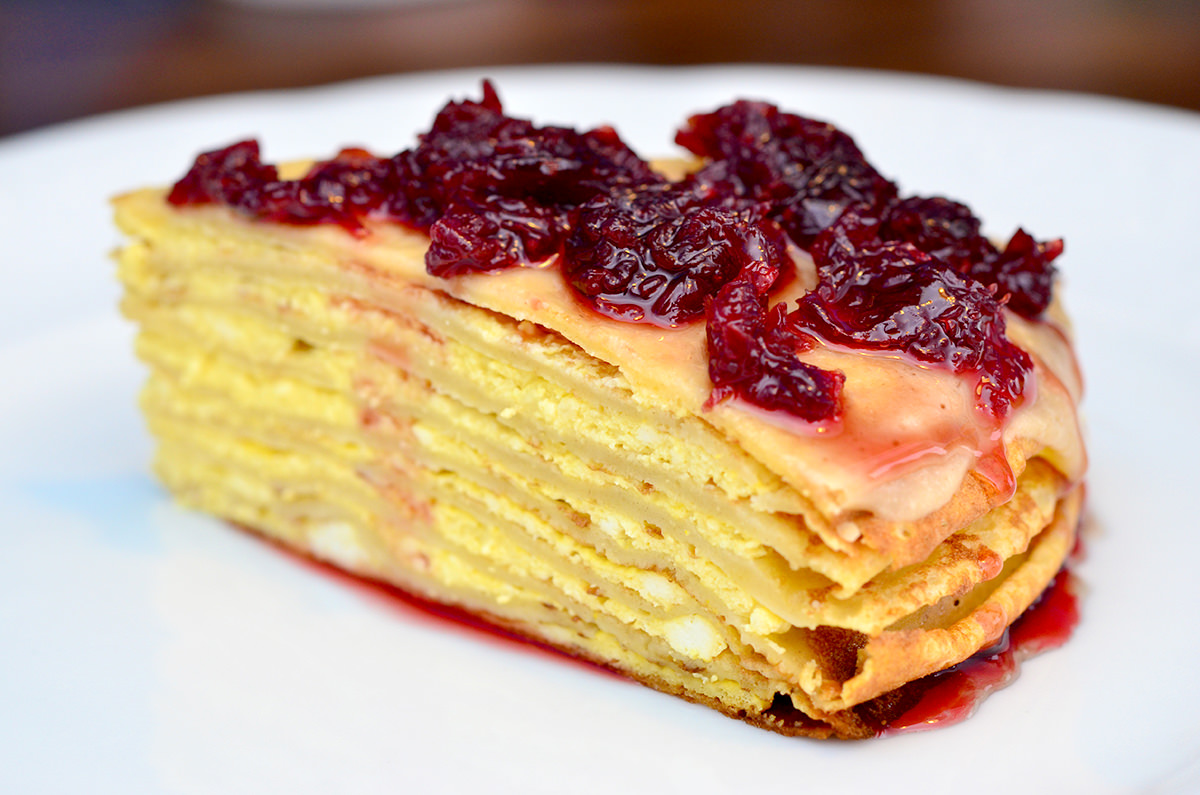 Se adaugă o clătită, apoi un strat uniform de cremă de urdă, apoi o altă clătită, din nou cremă şi tot aşa.