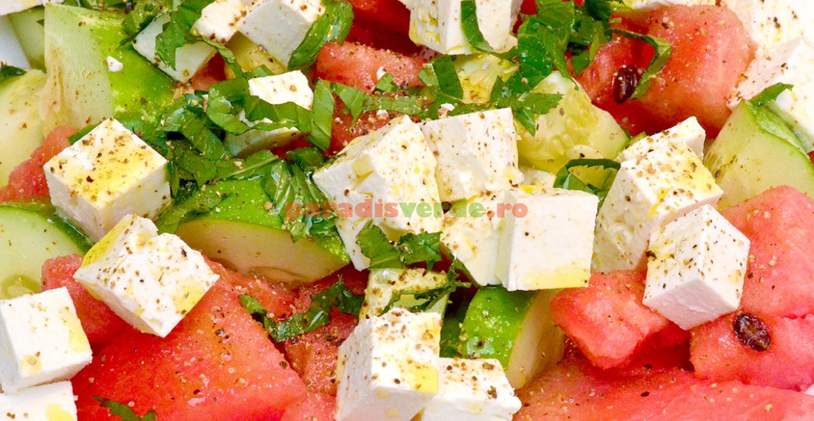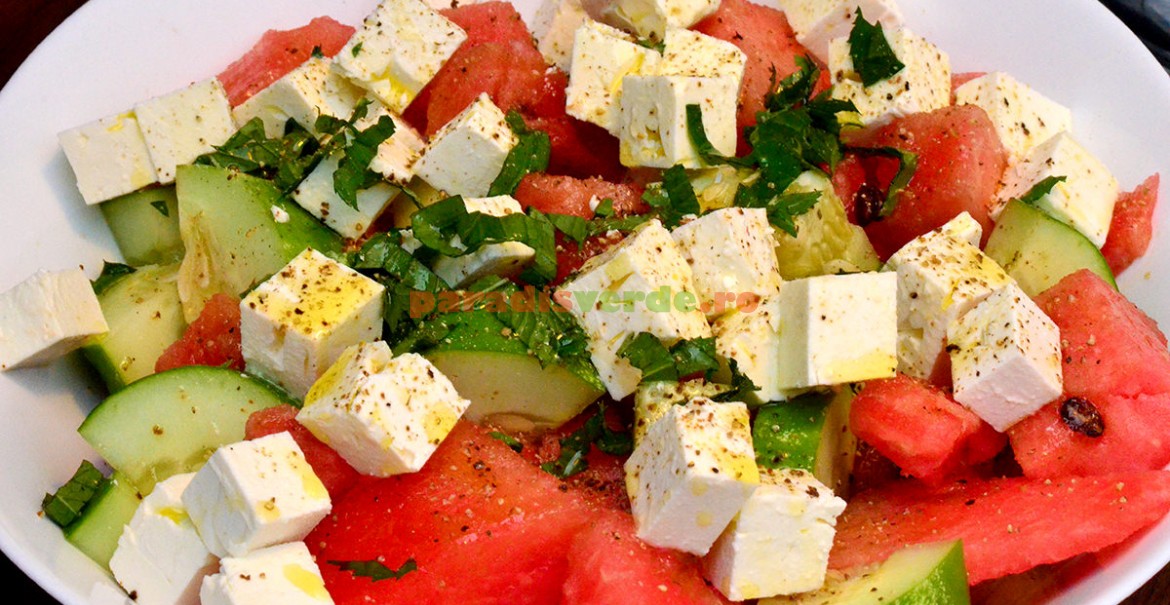 Salata de harbuz cu brânză feta poate fi un prânz excelent de vară, putând fi asortată, fără probleme, cu o pâine de calitate.
