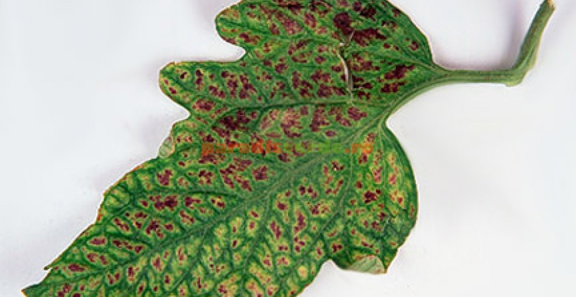 Frunzele apar clorozate, de culoare galbenă, cu nervurile şi marginile limbului riaşiatice-violacee.
