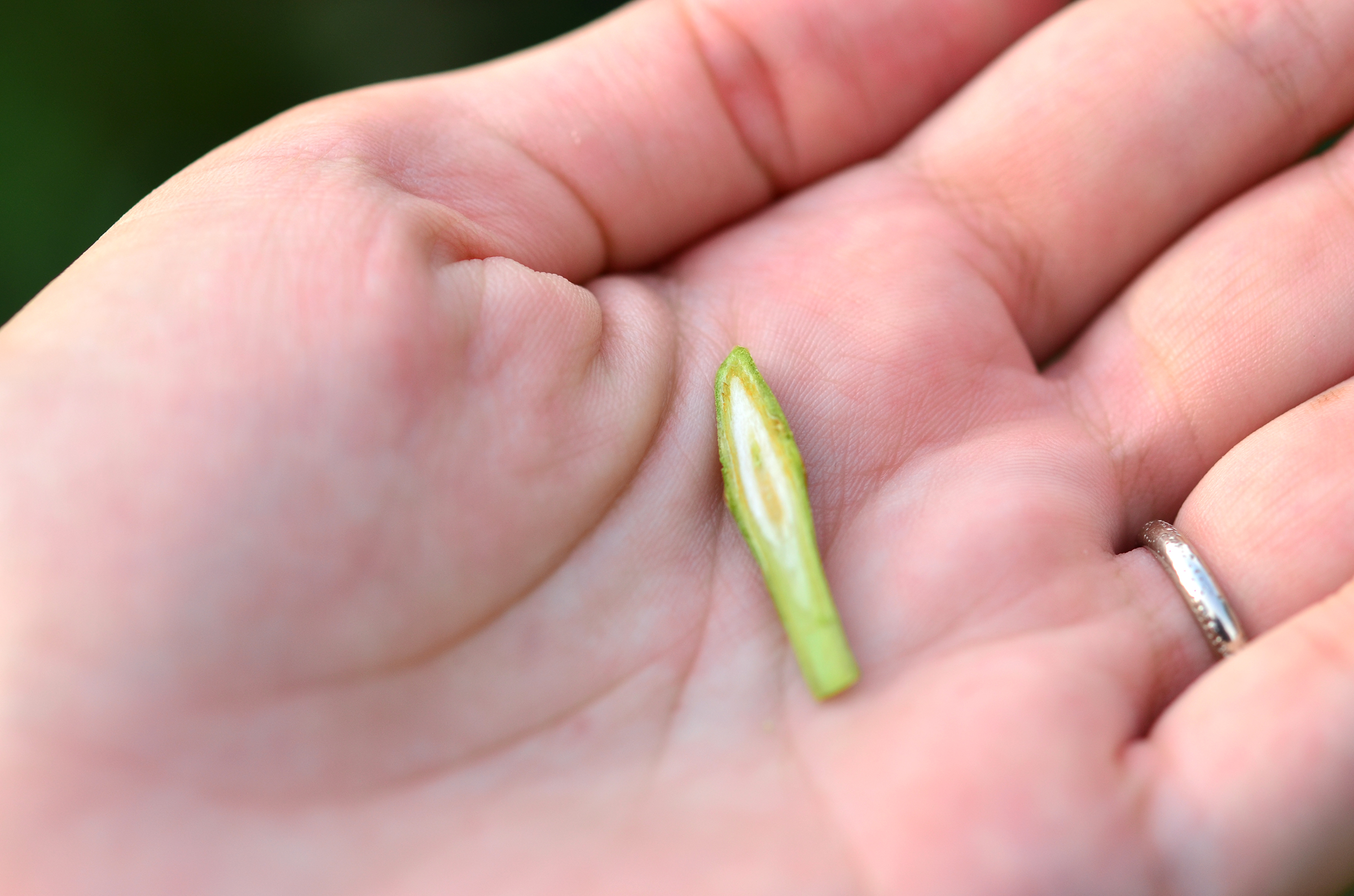 Intervalul dintre prelevarea unui mugure altoi și inserarea acestuia în buzunarul portaltoiului trebuie să fie cât mai scurt. Orice întârziere scade șansele de prindere. În imaginea care urmează vedem un mugure deja oxidat (linia cambială este brunificată), cu șanse foarte mici de prindere.