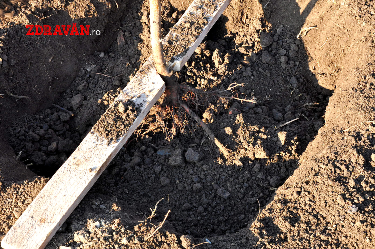 În solurile cu umiditate mai ridicată, pomul poate fi plantat cu 1-2 cm mai la suprafaţă.