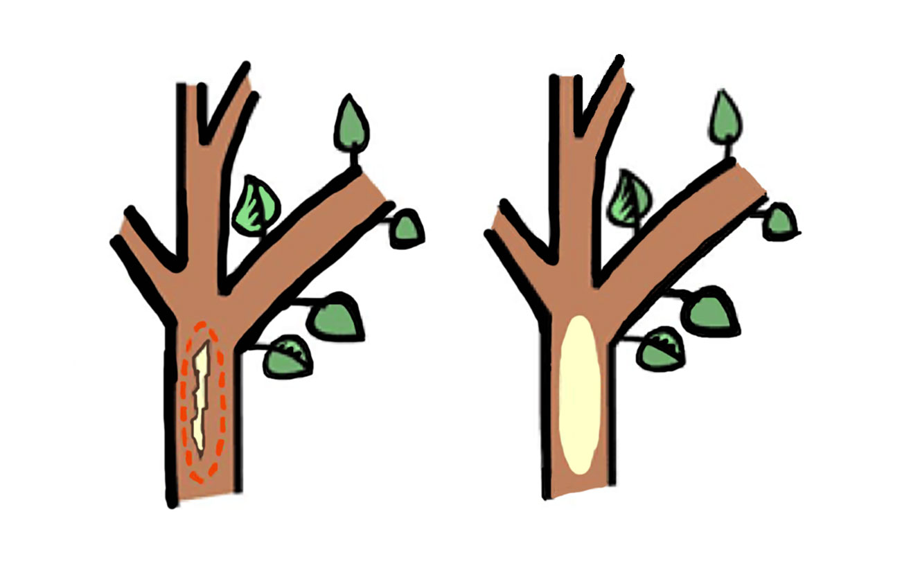 - Se decupează zona de scoarță afectată, iar dacă a crăpat și trunchiul, se răzuiește inclusiv crăpătura.