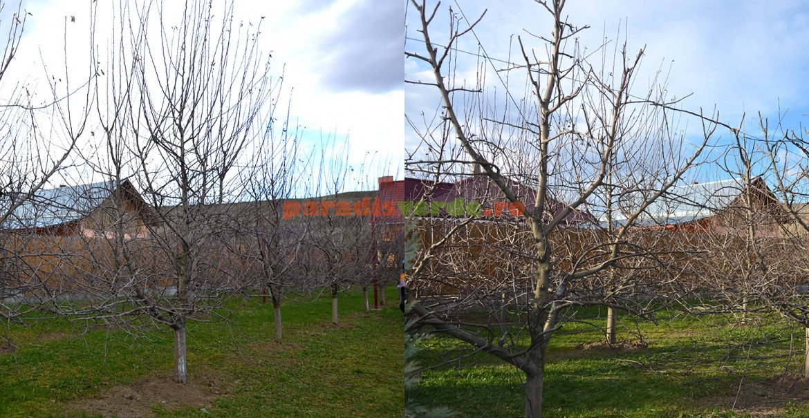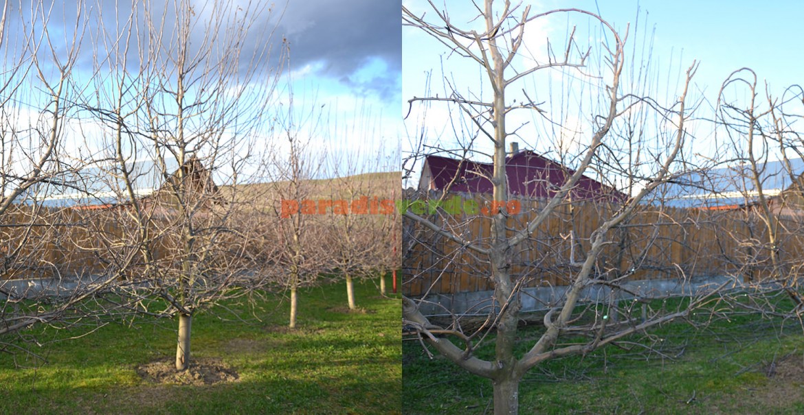 - Pomii din imagine au 7 ani și coroanele au fost conduse să formeze palmete cu brațe oblice.
