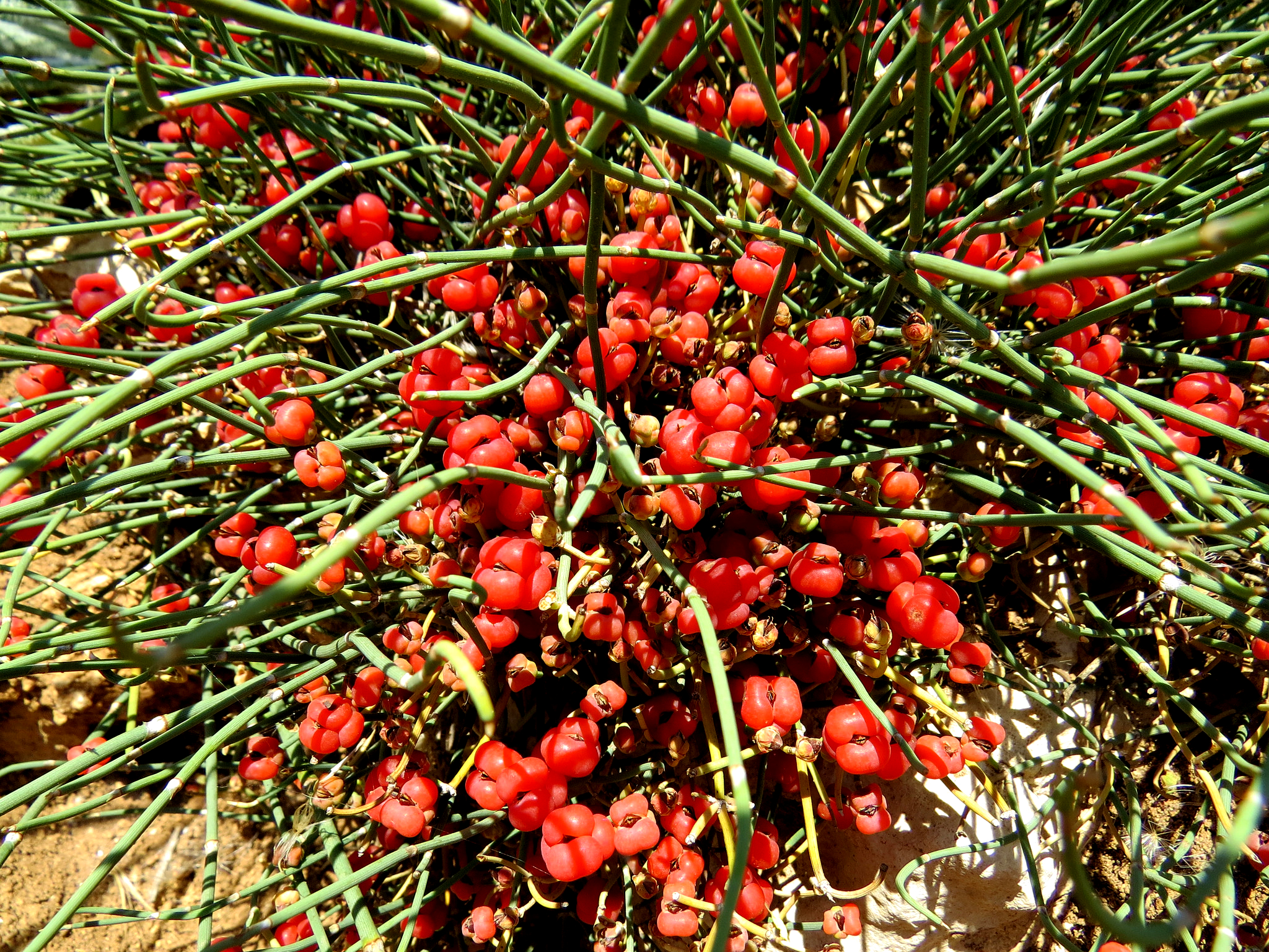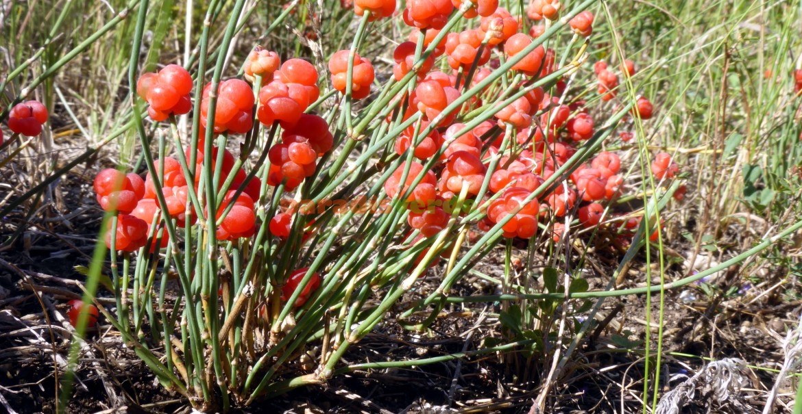 - Ramurile, foarte numeroase, au noduri și sunt atârnate sau culcate, de culoare verde-brumată.