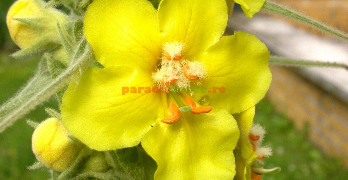 - Florile sunt mari, pe tipul 5 (5 petale, 5 sepale), de un galben strălucitor, dispuse în racem pe jumătatea superioară a tulpinii.