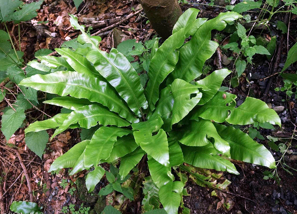- Frunzele sunt întregi, lungi de 30 - 40 cm, ondulate, lucioase. Au dungi brune de sori de-a lungul nervurii mediane.
