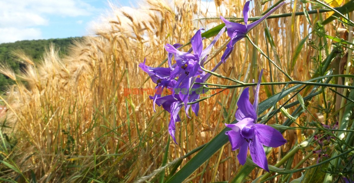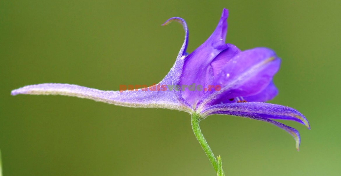 - Florile sunt albastru-violacee, cu un pinten lung de până la 15 cm, care face ca planta să fie foarte ușor de recunoscut.