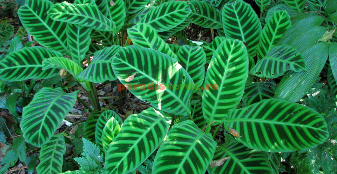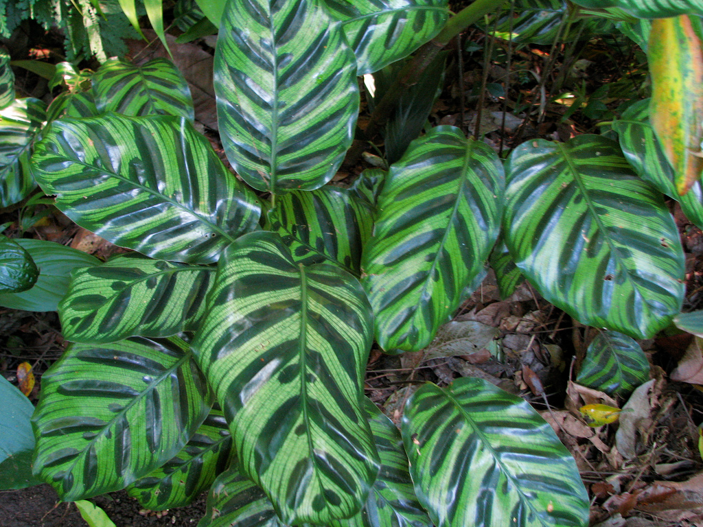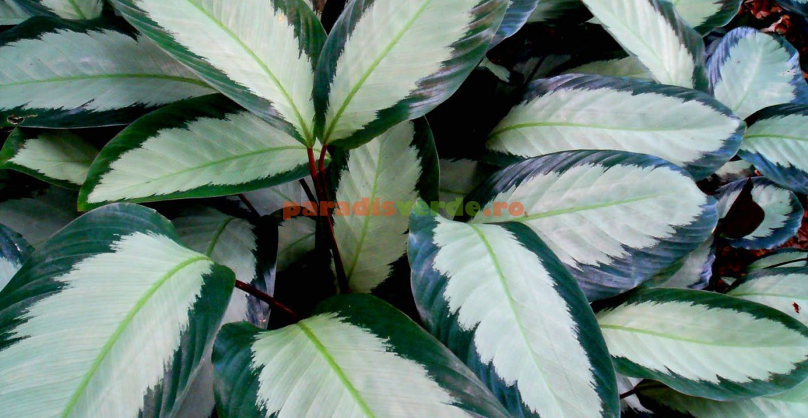 Au lungimi cuprinse între 15 - 20 cm, formă ovală, sunt fine și orientate în sus. Pețiolurile lungi încep direct din rădăcină. Frunzele plantei - păun au dungi subțiri verzi și albe - argintii, care alternează cu pete alungite de culoare verde - întunecat și bordo pe spate.