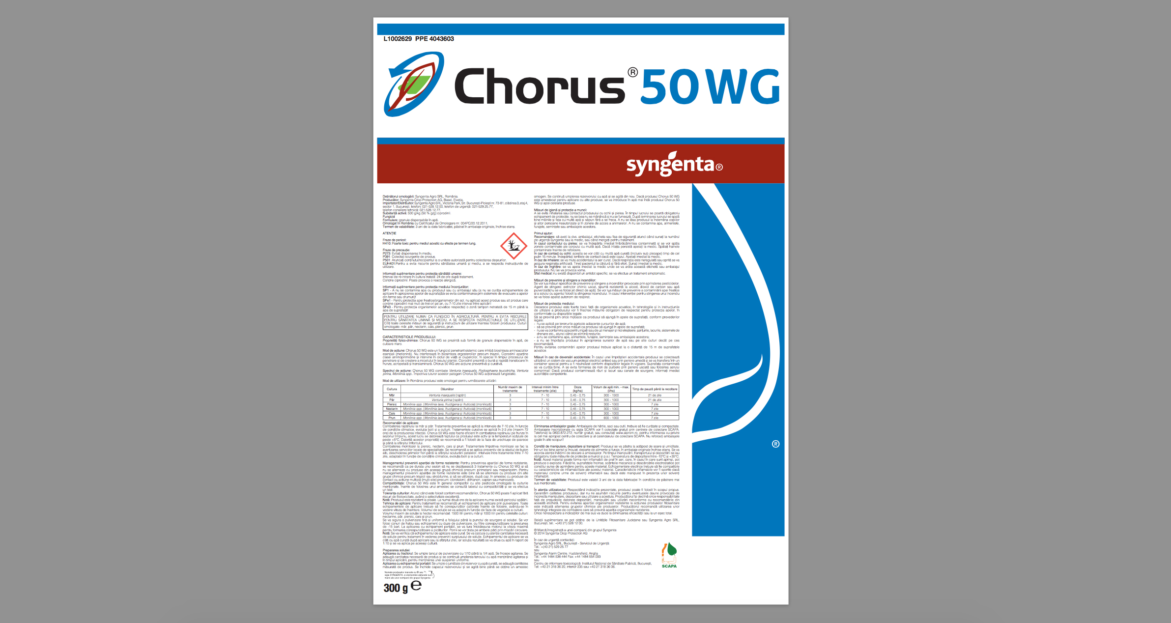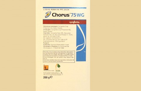 - Chorus 50 WG este în general compatibil cu alte pesticide omologate la culturile menţionate. Înainte de folosirea unui amestec se consultă tabelul cu compatibilităţi şi se va efectua un test.