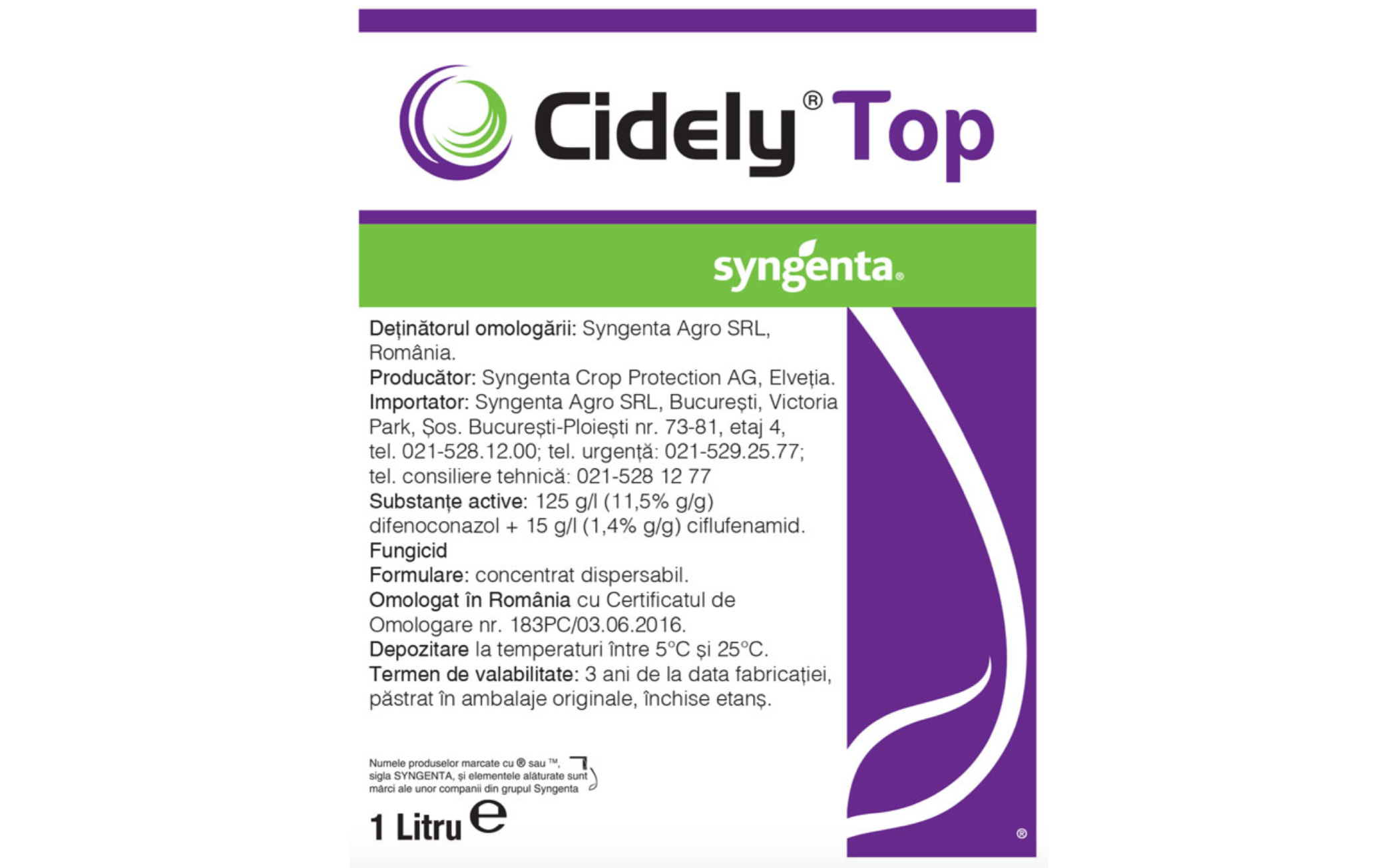 - Cidely Top este un fungicid sistemic compus, cu spectru larg în combaterea bolilor foliare la familiile de Solanaceae, Cucurbitaceae și arbuști fructiferi, având un control excelent împotriva făinării și pătărilor de frunză.