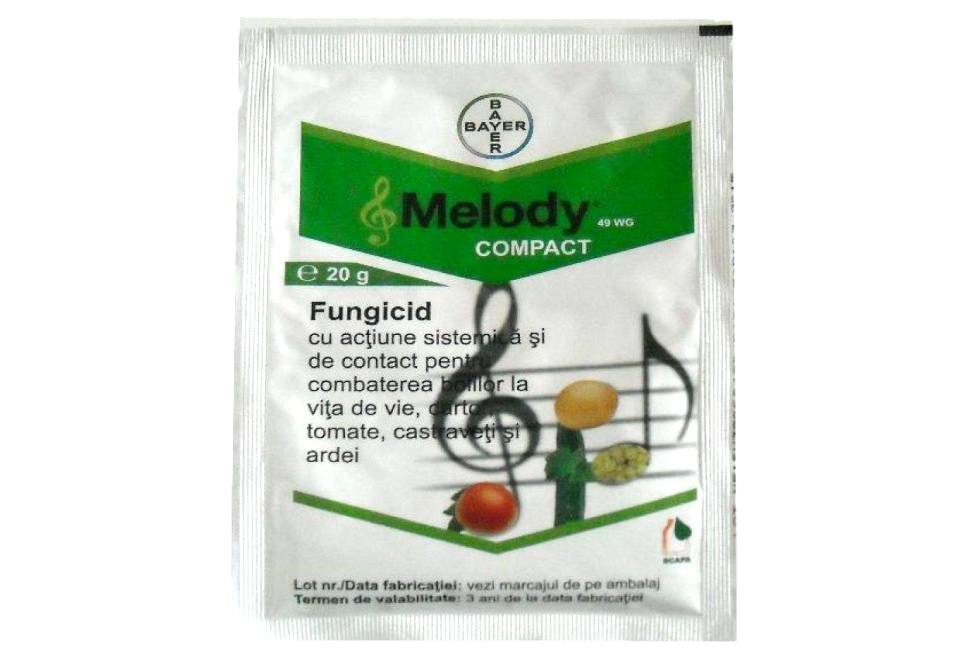 - Prin componenta iprovalicarb, Melody Compact actionează preventiv împotriva germinării sporilor, curativ prin stoparea în primele două zile după producerea infecției a creșterii miceliului intracelular și antisporulant, dacă infecția a avut loc deja, oprind formarea fructificațiilor și sporularea. În acest fel este stopata diseminarea manei.