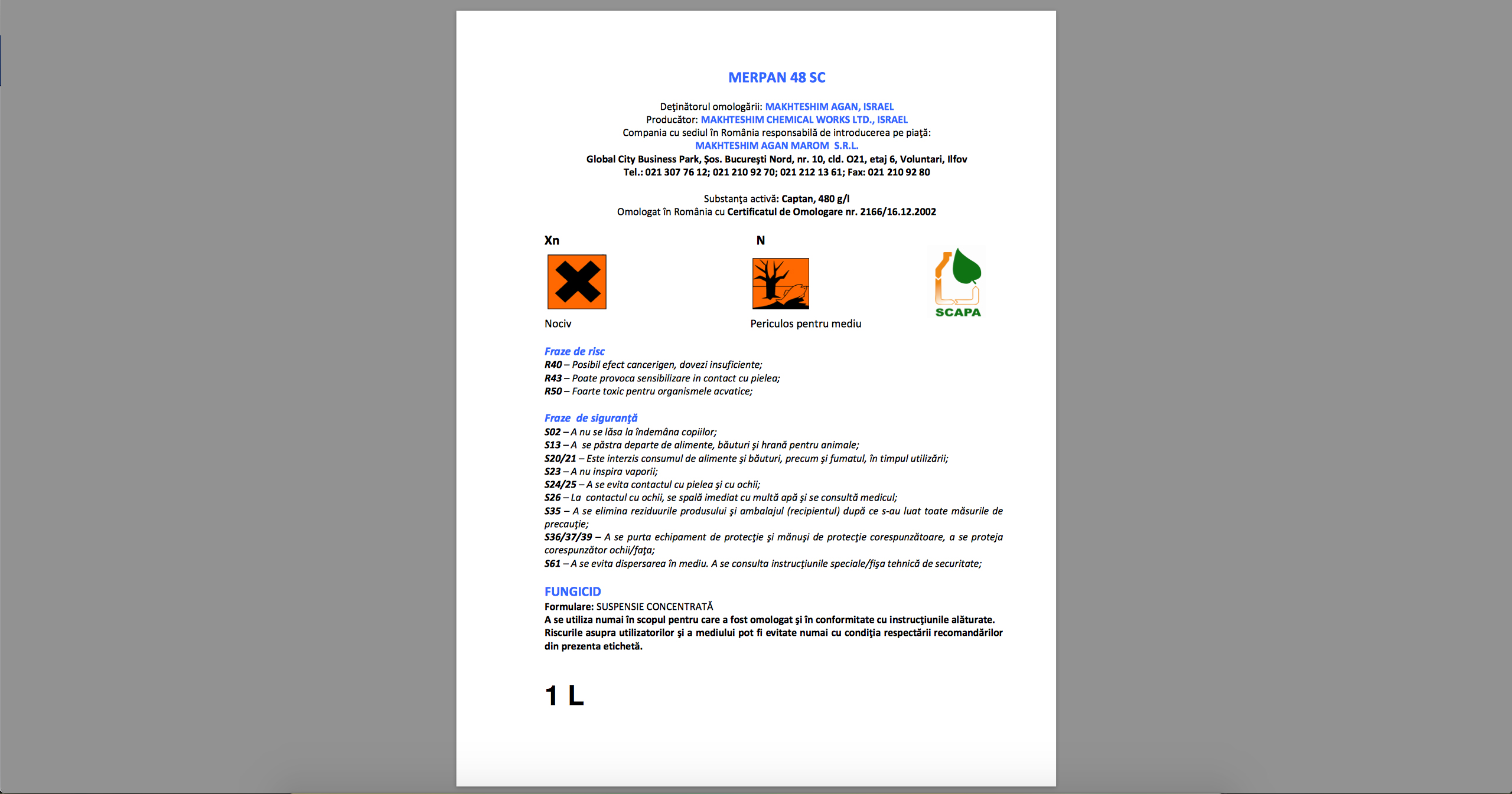 - În anumite condiții, MERPAN 48 SC a dovedit o acțiune eradicantă și de stopare a infecțiilor incipiente.