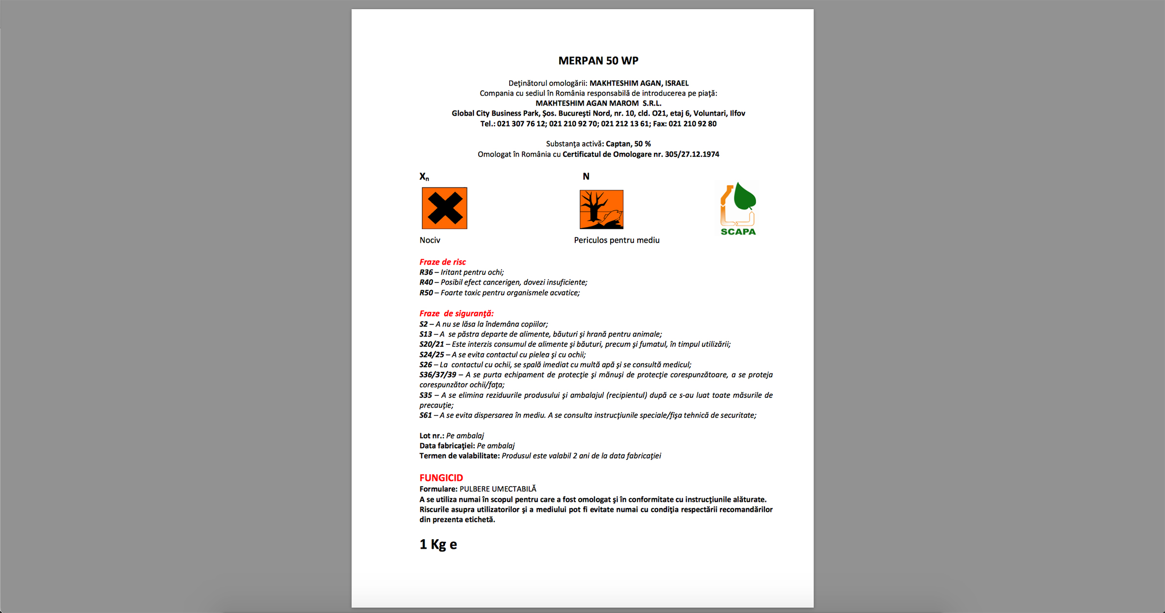 - Fungicid cu acțiune de contact pe bază de captan cu acțiune de contact.