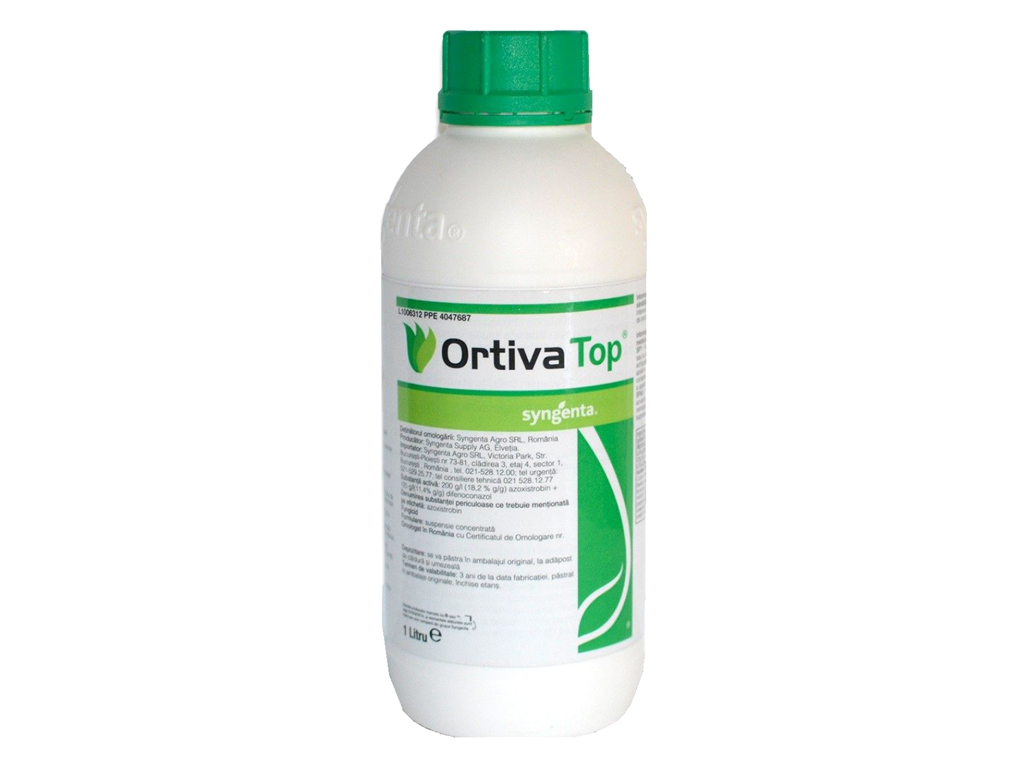 - Ortiva Top conţine două ingrediente active (azoxistrobin şi difenoconazol) cu activitate de contact şi sistemică locală şi translaminară.