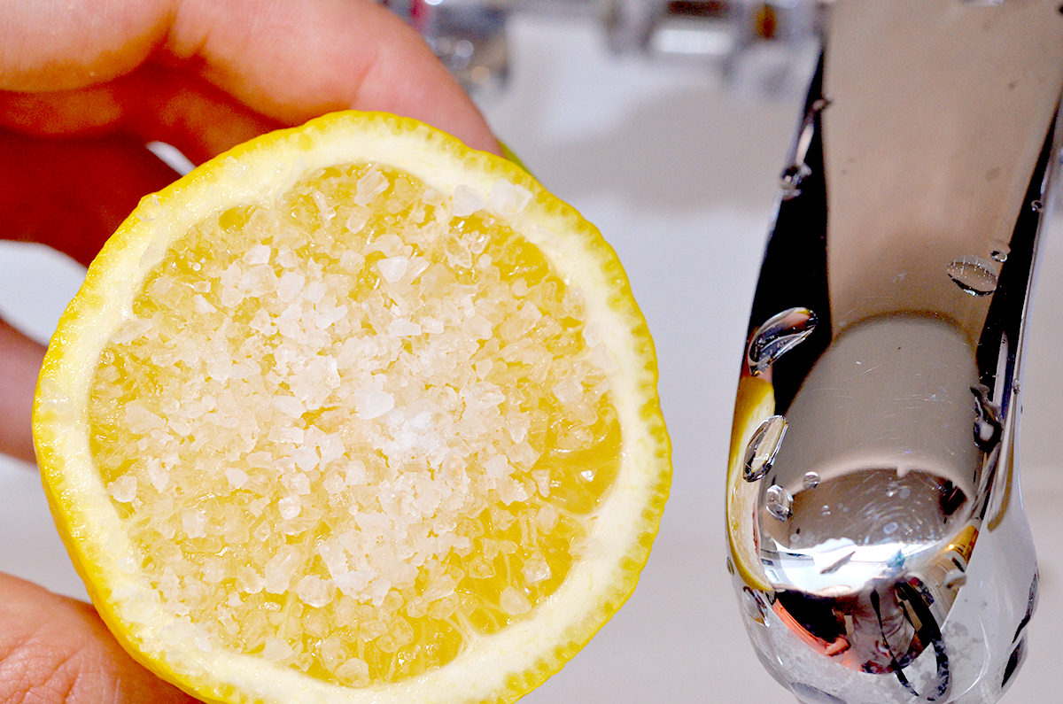 Tăiem lămâile sau grepfrutul în două şi presărăm sare (ca în imagine).