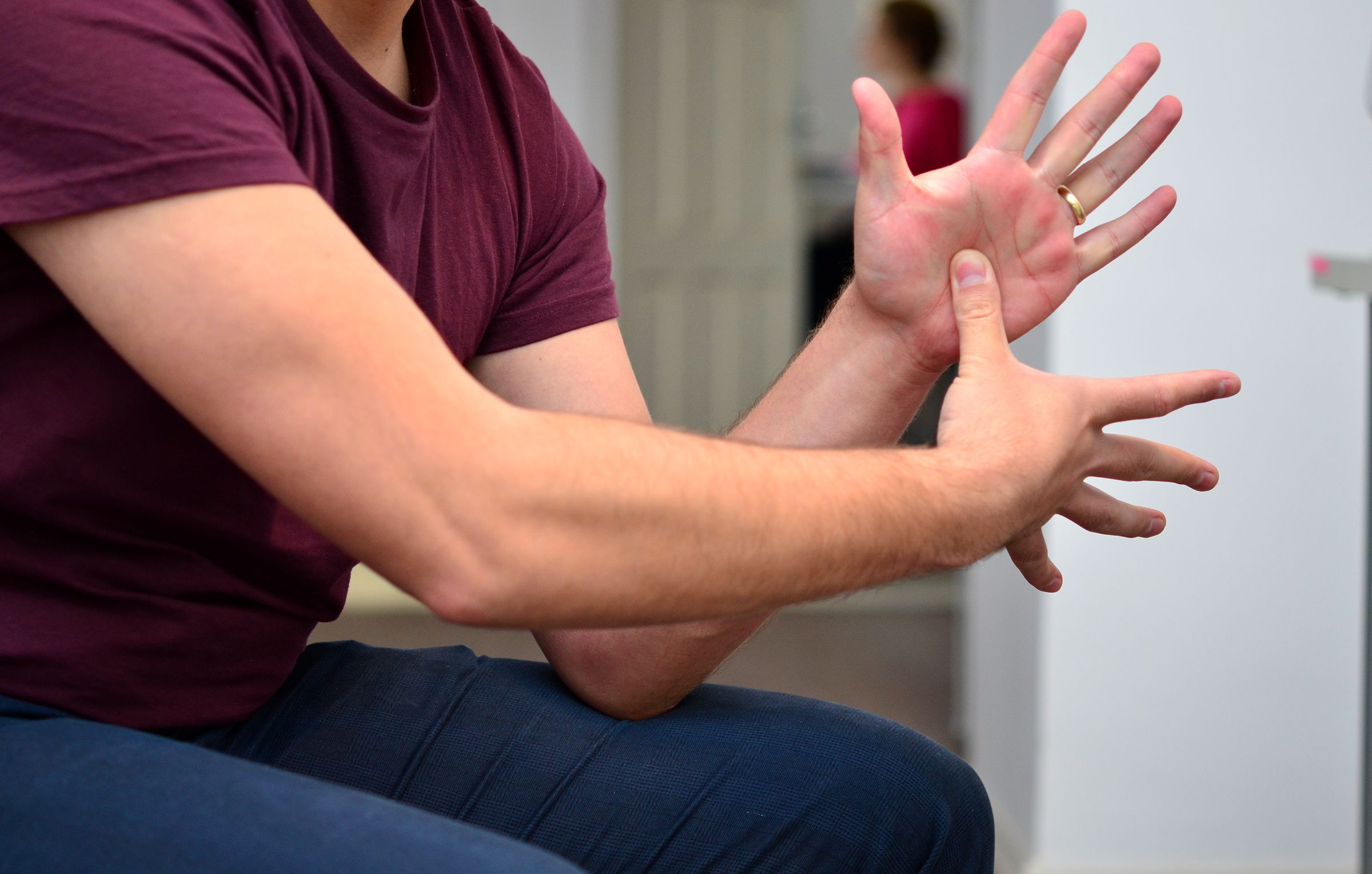 1. Stați pe scaun, așezați-vă mâna stângă pe genunchi, cu palma deschisă în sus. Cu degetul mare de la mâna dreaptă, apăsați puternic în centrul palmei; cu cât mai tare, cu atât mai bine. Funcționează și dacă apăsați articulația dintre arătător și degetul mare, prin care se distrage atenția sistemului nervos central.