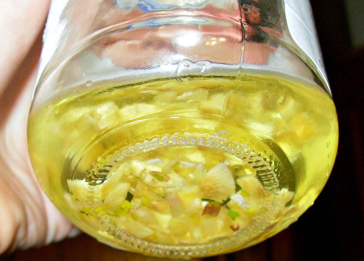 b) Se toarnă uleiul într-un borcănel de sticlă, apoi se adaugă usturoi mărunţit, cât să ocupe 1/4 din volumul de ulei.